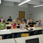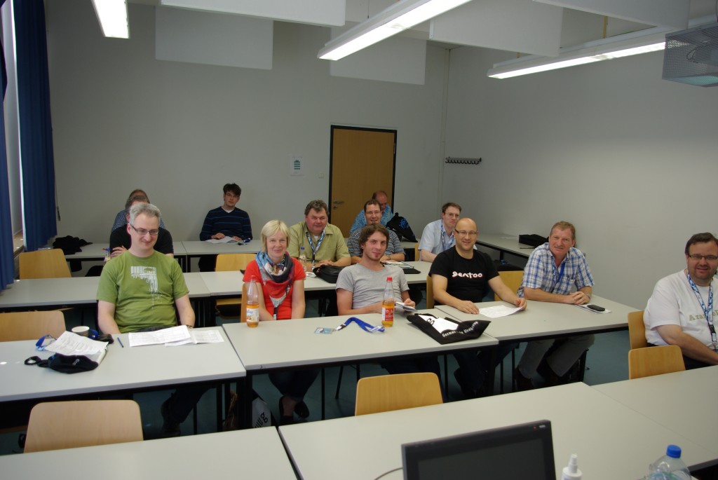In the afternoon I had a talk about obs. You can see my students on the picture. I spoke about obs, showed some advantages and showed them the interface. As usual, you can find slides from my talk on github, fork them and use them for your own presentation. Or if you want, you can just download the pdf. There were some questions and people were quite interested in such a small group. Usually on big events with big audience, quite some people show up, listen, but almost nobody really cares. These people had to go to the workshop room and they were interested and talked to me back. After obs talk, I invited them to the packaging workshop we had afterwards with colleague from Mageia and Fedora. There was smaller audience but as there were three of us and two of them actually spoke German, we divided quickly into small groups.