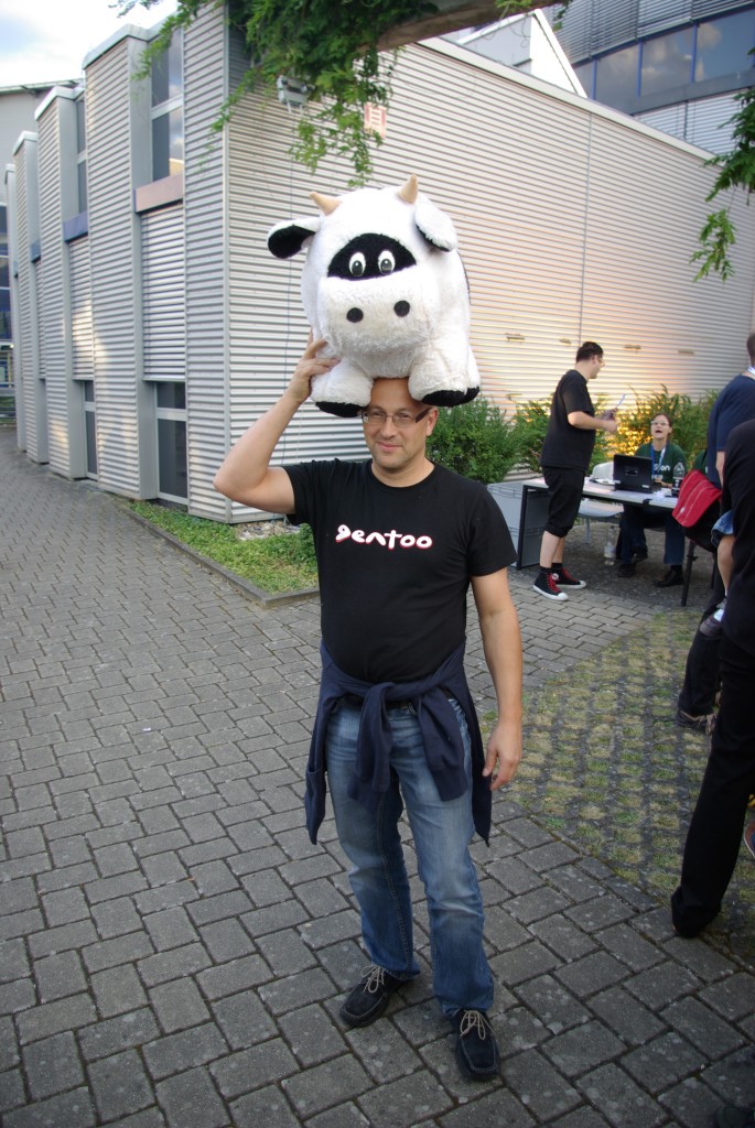 What else did we do? There was a social event, where we got some sausages and local beer. According to local customs, beer is served in tiny (0.2l) glasses. I also met there a Gentoo guy who was carrying Larry the cow!