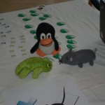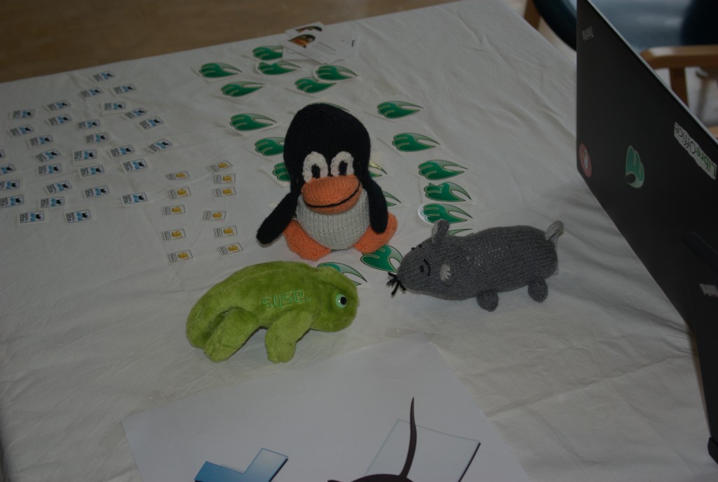 Now let’s get back to FrOSCon. It is annual event in Sankt Augustin, little bit to south from Collogne. I also spoke beforehand with Jan and since I was going there because of talk and workshop, my plan was to spend rest of my time during conference helping out with booth. So let’s start with booth. Jans brought computer with openSUSE 12.2 to show to people and plenty of DVDs, stickers and posters. I brought my plush Geeko, but unfortunately first day he decided that he will rather stay at hotel and while I was leaving my room to go to the bus station, he left my backpack and stayed at the hotel. He was found by friendly hotel stuff and awaited my return on reception desk. And I believe he regretted staying behind later as during the second day, he made a lot of friends on the conference as you can see on the photo.