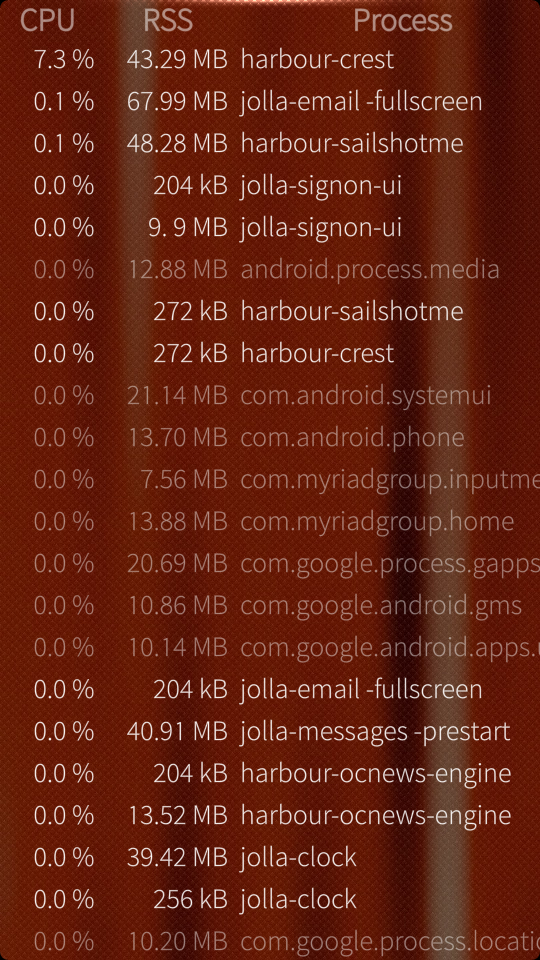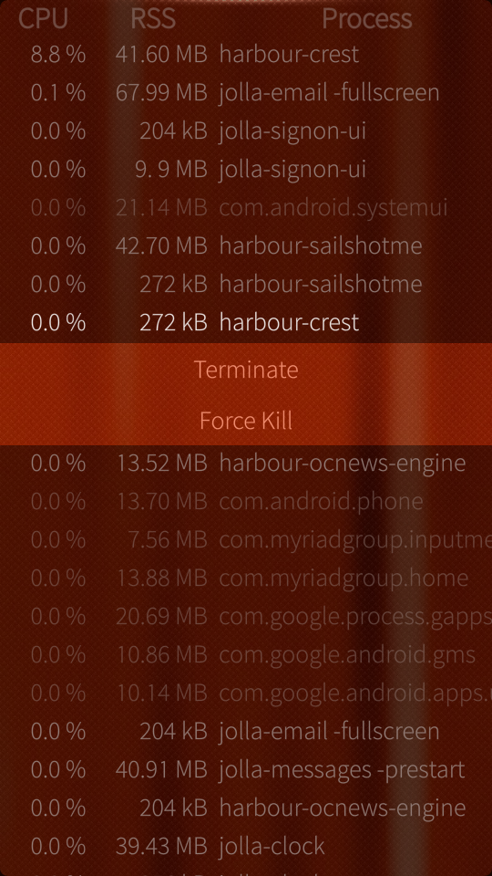 My second application is also simple. It’s top-like application. Shows processes, how much memory (RSS) and CPU they use, allows you to sort them, filter for GUI applications only and most importantly – allows you to kill processes you don’t like. Not much more to write about in regards to this. Just a set of links to OpenRepos and GitHub and few screenshots.